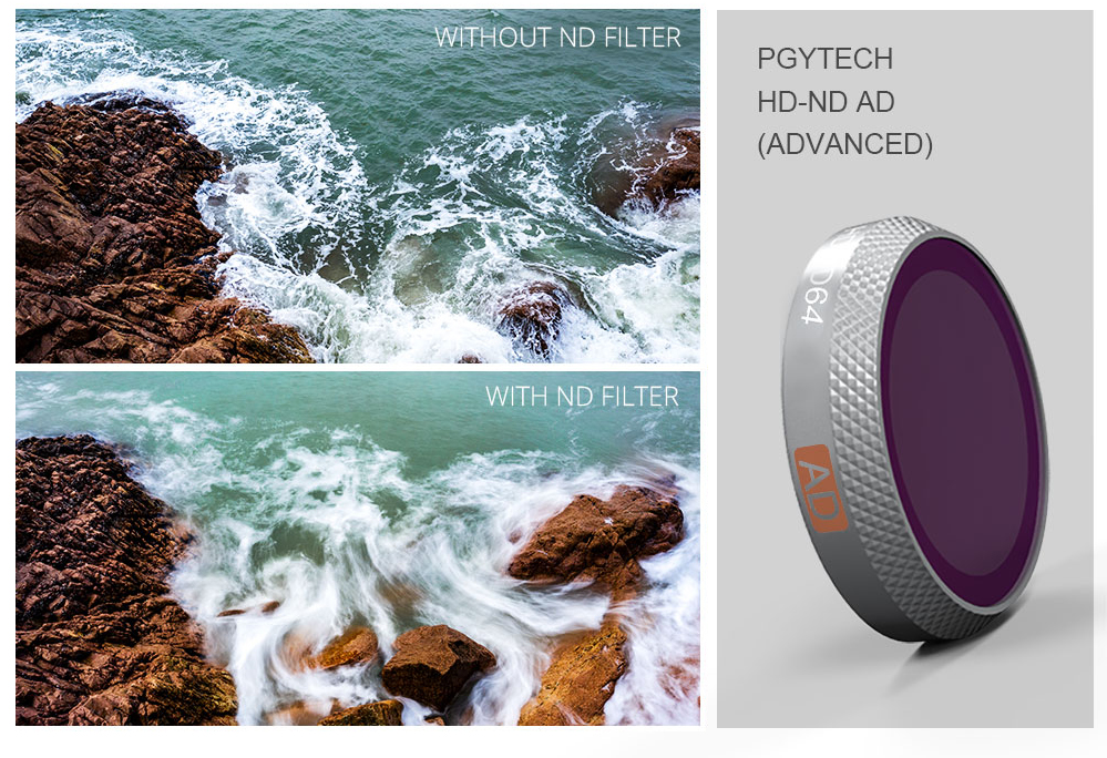 ND-filter kan kallas för ljusreducerande filter för sin förmåga att minska mängden ljus som når kameran. Den kan minska mängden ljus i väldigt ljusa förhållanden så att kameran får en korrekt exponering och så att alltför ljusa bilder undviks. Den förbättrar även färgmättnaden, och gör bilden mer transparent och levande. Du kan använda långa slutartider med filtret för att få vissa speciella effekter som: dimma, fin rörelseoskärpa vid vatten i rörelse, etc. Vid videoklipp kan du använda längre slutartider för att få till en lämplig röreslseoskärpa för ett mer balanserat videoutseende. Dessa ND-filter är utformade med bearbetat optiskt glas för att säkerställa en högupplöst bildkvalitet (HD)